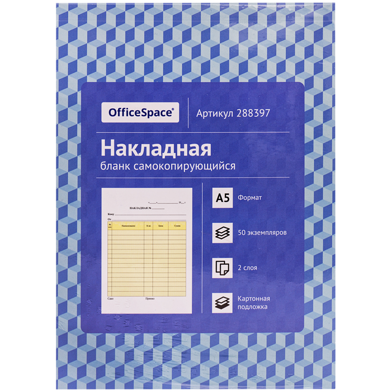 Бланк двухслойный самокопирующийся "Накладная" в картонной обложке с подложкой. Самокопирующийся бланк изготовлен из самокопирующейся бумаги. На верхний лист текст наносится обыкновенной ручкой, карандашом или матричным принтером. Оттиск черного цвета появляется одномоментно на нижележащем листе. Благодаря картонной подложке, даже при сильном нажите текст отпечатается на нужном количестве листов. Бланки изготовлены из офсетной бумаги. В склейке 50 экземпляров. Упаковка в термоусадочную пленку.